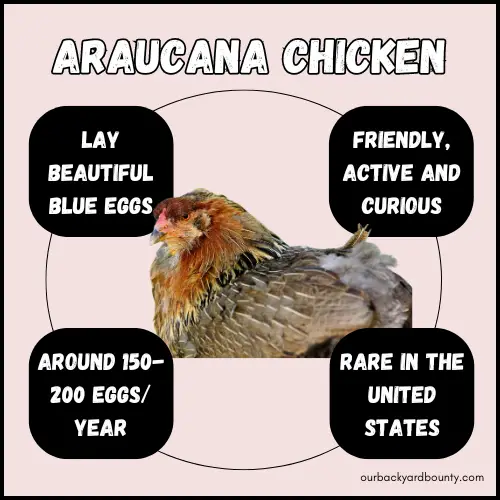 The Araucana chicken, hailing from the Araucanía region of Chile, is a breed steeped in history and intrigue. Renowned for its distinctive appearance and remarkable blue eggs, the Araucana stands out as a true icon of the poultry world. Characterized by its tufted cheeks, rumpless body, and vibrant plumage, this breed embodies both elegance and uniqueness. However, it’s the eggs of the Araucana that truly steal the show. With hues ranging from sky blue to teal, these eggs add a touch of wonder to any egg collection. Beyond their beauty, Araucanas are known for their spirited personalities and independent nature. This breed is often confused with the Ameraucana chicken, but they’re actually totally separate breeds. The Araucana is much more difficult to find in the United States.